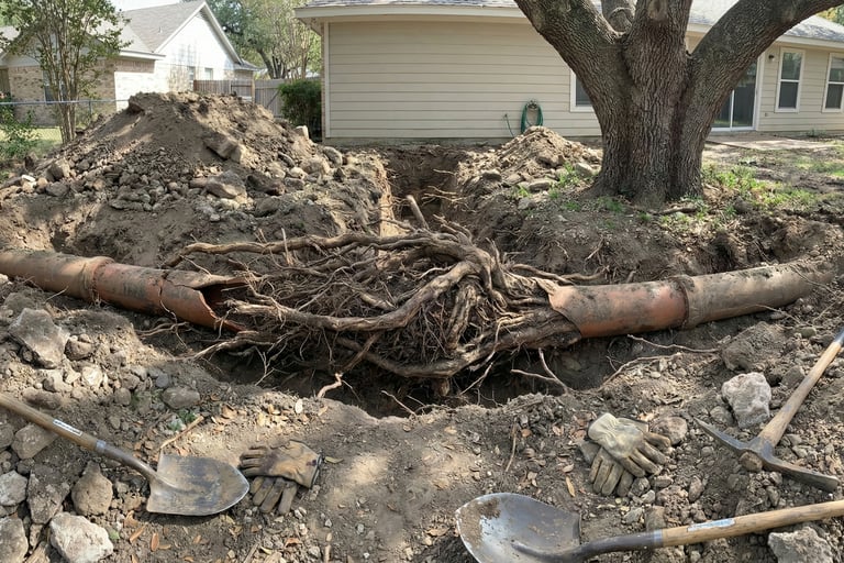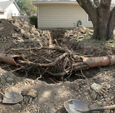 Tree Root Intrusion: Roots seek moisture inside pipes and expand through small cracks, eventually breaking the line.